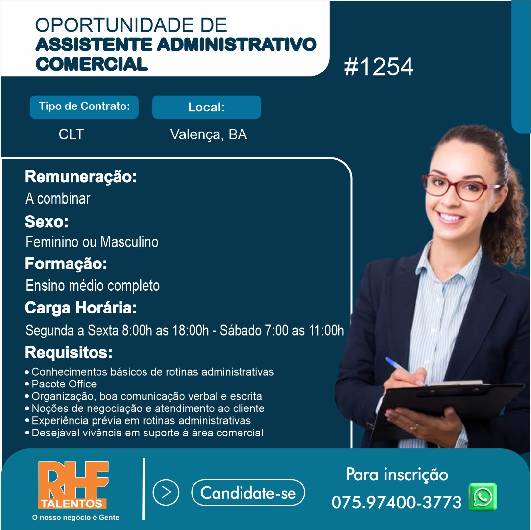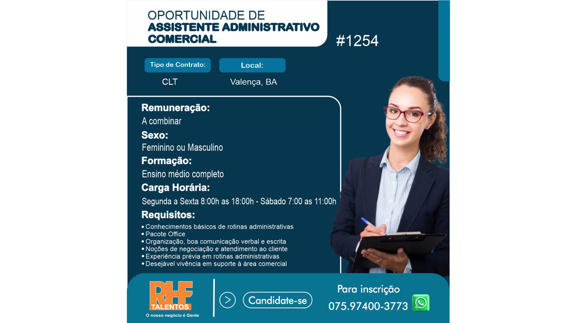 Estamos em busca de um Atendente Administrativo Comercial para se juntar à nossa equipe na Valença, Bahia.
