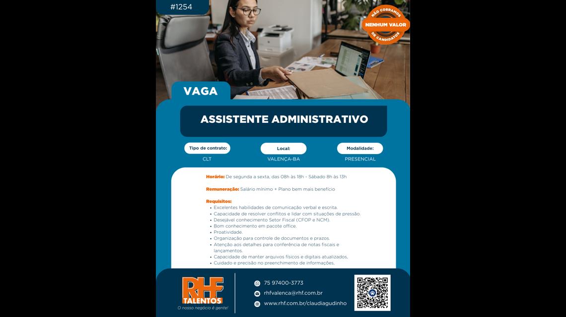 Oportunidade: Estamos abrindo uma vaga para Assistente Administrativo Fiscal em Valença, Bahia.